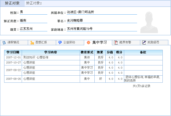 2、矫正人员变更信息 记录矫正对象在矫正期间的各种变更信息,如重新犯罪、逃脱、收监执行等行为,自动生成报表, 方便统计查询。 3、层级管理 按照矫正工作者的管理范围,自动产生矫正对象的各种统计报表。 4、积分查询 查询矫正对象的每个月考核积分情况,并可以用图表形象的显示矫正对象考核积分的波动情况。 |