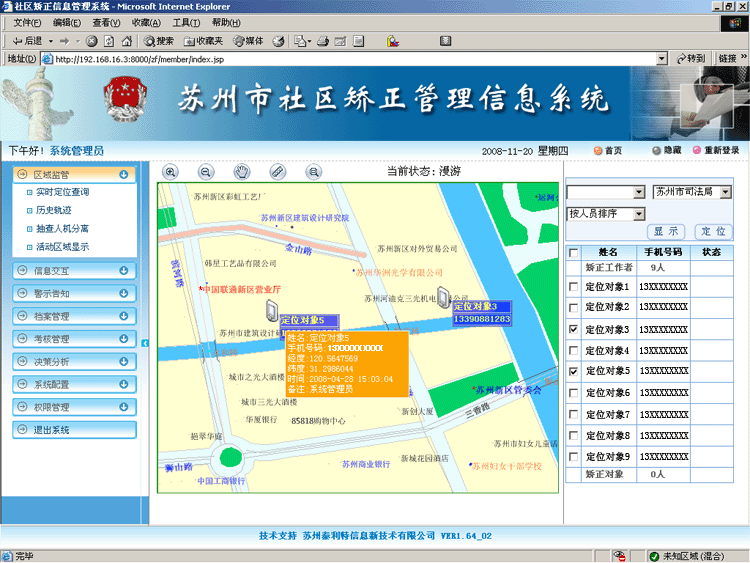 | 社区矫正管理信息系统,通过手机定位技术实现对矫正对象位置的监管, 同时具备完善的矫正对象电子档案,查询统计功能,并包含了矫正对象的日常管理考核,给矫正工作人员的日常工作带来了信息化、标准化、 智能化的高效管理平台。 |