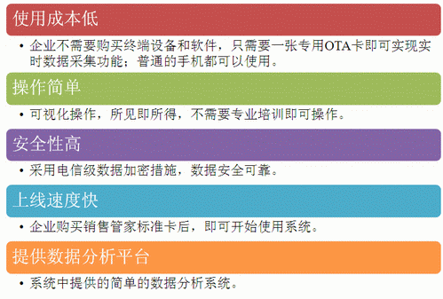 采用OTA技术的终端数据采集方案是所有终端数据采集方案中成本最低的一种。 因为各家企业的数据采集需求不同,需要根据各家企业的需要定制不同的OTA卡,相应的增加了 投入成本。为节省开发成本,让企业快捷方便的使用OTA方案,联通公司推出了销售管家标准卡。我们公司开发了销售管家标准应用平台,可以实现OTA软件开发、 数据统计分析等功能。 |