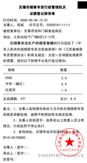 在现场,专卖执法人员发现违法违规的现象, 可以通过智能手持平台,选择相应品牌和违法行为,实现相关的证据登记保存单和勘验笔录的打印。