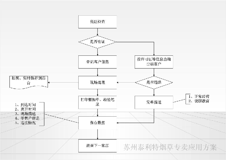 专卖稽查工作人员日常走访市场时候,可以应用智能手持平台进行日常业务处理, 日常处理的数据如:巡查的记录、登记保存单、勘验笔录等等数据可以实时保存到后台数据库中, 而且对于专卖稽查人员在现场的执法的过程中提供详实的资料支持,比如:该零售户的销售记录、历史案件记录、历史巡查记录等等。 而后台管理人员可以通过后台系统实时的看到市场的巡查的结果,巡查的内容以及相关巡查人员的历史轨迹。