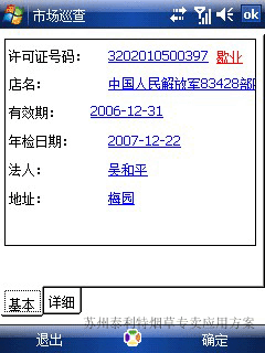 系统可以通过许可证号码或者店名地址等信息实现模糊查询,查询出当前巡查客户的详细业务、专卖等相关资料信息,为市场巡查人员稽查提供数据上的支持。