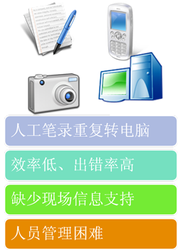 在当前烟草系统内,一线工作人员在工作和管理过程中总是会存在如下几个方面的问题: 1、 工作量大、效率低 烟草客户经理和稽查人员的服务职能越是凸显其重要性,对零售户的服务力度越是大,工作量也就越加的大,不仅仅需要指导经营、宣传政策,更加是要采集零售户多种信息如销售、库存、评分等数据,以备后台程序统计分析,供营销、专卖等部门决策分析,通常在没有设备的情况下工作人员只能通过手工方式记录各种信息,效率极其低下。 2、 出错率高 由于在现场大量的手工工作,并且在回到了公司还需要再次人工录入电脑中,必然导致较高的错误率,从而影响到后台系统的分析和决策。 3、 服务现场信息量少 在零售户现场,零售户相关的信息无法获知,比如前几次的拜访情况如何?该零售户有没有历史案件记录?零售户信息只能通过记忆和现场的台账、送货小票等去了解,但是如果更加详尽的资料就只能回到公司通过电脑获知了。 4、 管理力度低 对客户经理的工作情况和绩效管理缺乏高效的工具和数据支持,只能靠日常抽查和平时的手工单据去统计分析。 5、 销售和专卖沟通效率低 专卖和业务在信息渠道上沟通效率低下,没有一个整合的信息流转平台,以便双方更好的协同工作,共同服务零售户,管理好市场。 |
