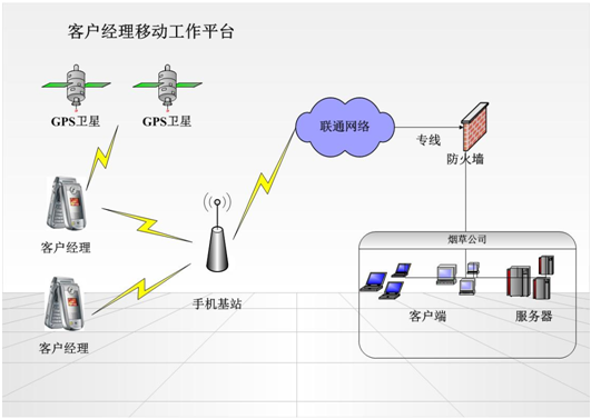 | 1、客户经理等一线工作人员配备专业软件的智能手机(android手机)。 2、现场查询和保存数据通过联通公司运营的WCDMA制式的3G网络。 3、实时和烟草公司业务系统的数据同步,以便及时准确的提供数据支持和存储数据。 4、应用GPS全球定位系统,为客户经理的管理提供支撑。 |